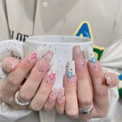 - A soft color palette of pastel pinks, purples, and blues paired with shimmering rhinestones adds a luxurious touch to each nail.