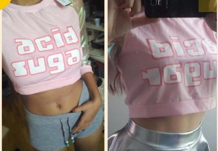 - This holographic crop top sweater has subtle rainbow reflective long sleeves, kawaii writing that says “acid sugar”, and a flattering loosely cropped fit that looks good on almost any body shape!
