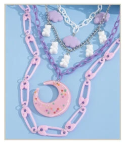 - Gummy bears, clouds, glittery moons, and candy colored chains!