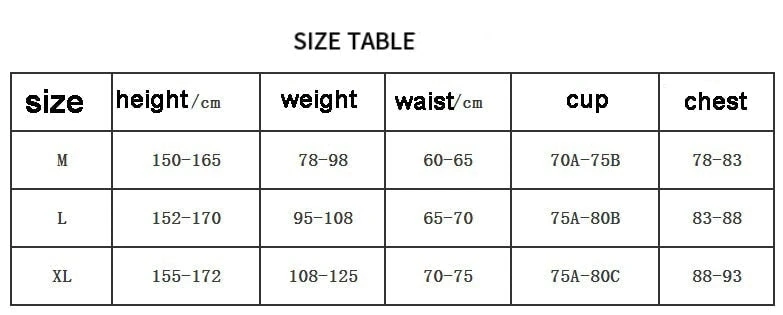 Size Bust Waist M 78-83cm 60-65cm L 83-88cm 65-70cm XL 88-93cm 70-75cm