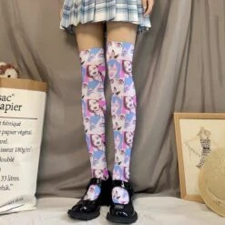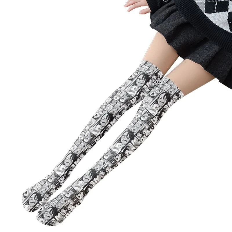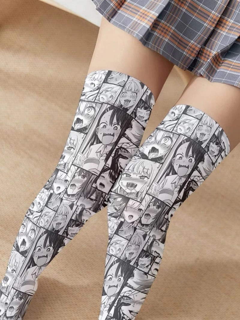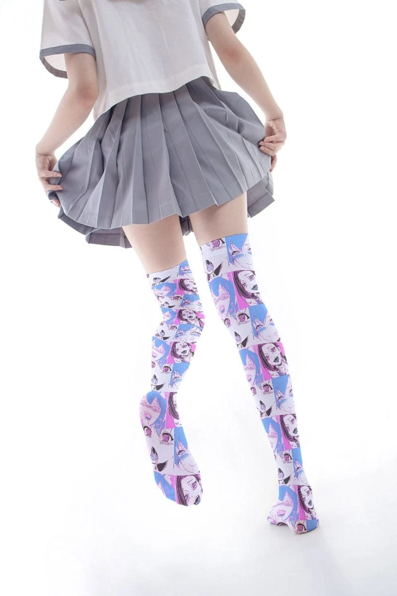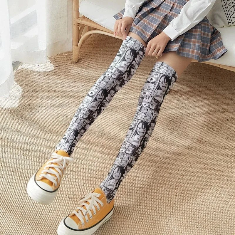 - This thigh high socks feature a comic book style strip of kawaii anime faces.