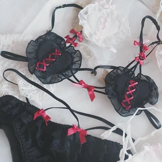 - Featuring adorable corset style laces along the cups, sweet girly ribbons & bows, and a cute harness style pair of underpants that perfectly match, this set is sure to impress!