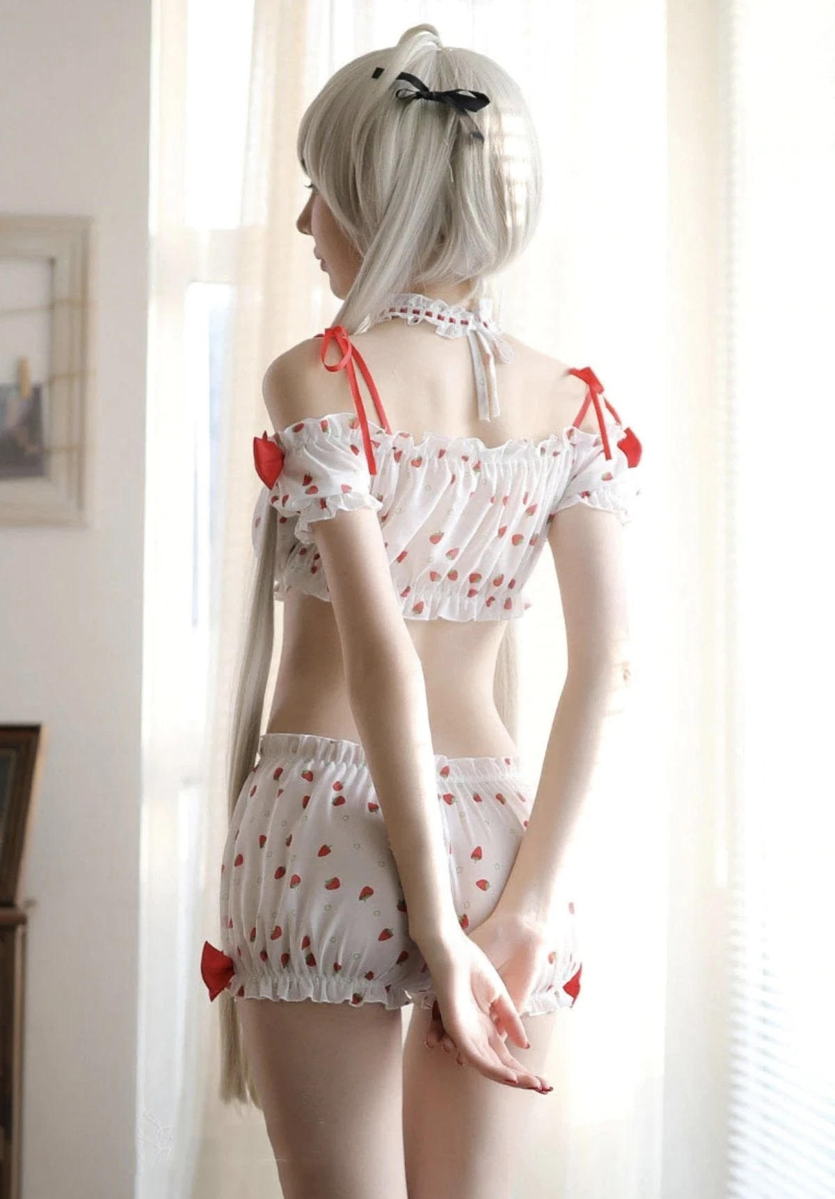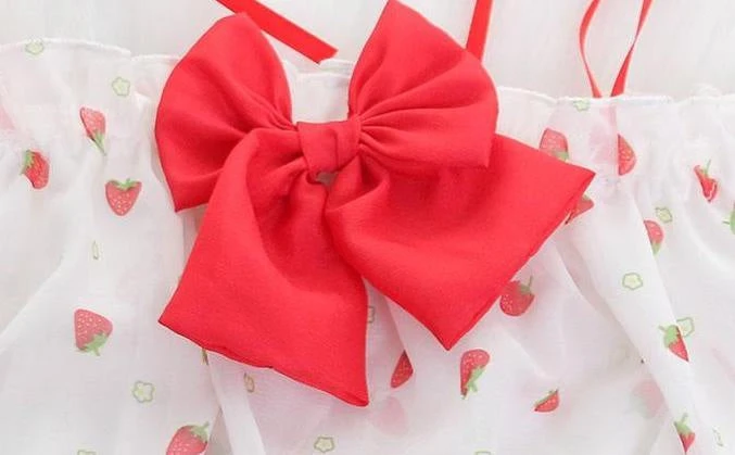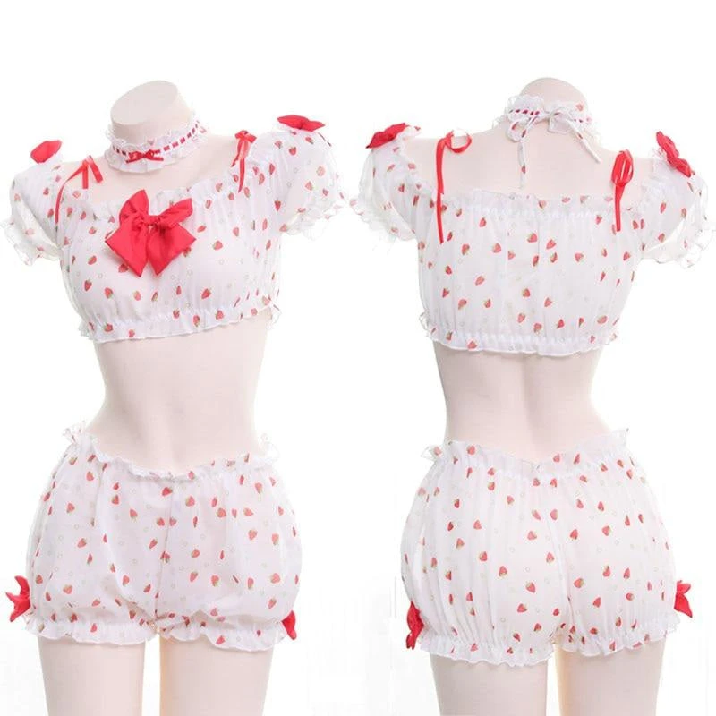 This sweet strawberry-polkadot farm girl inspired set combines the innocence of youthful bows and ruffled sleeves, with the kawaii appeal.