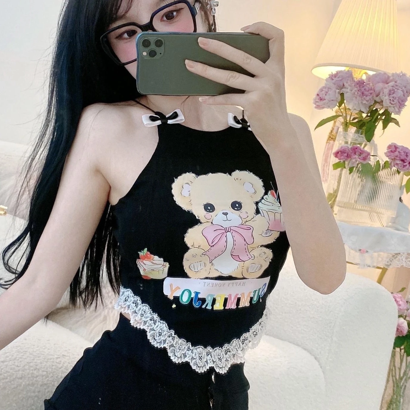 - This adorable cupcake teddy bear crop top has sweet lacey trim, sweet ribbons on the spaghettis traps, with a cute little bear on the chest displaying a cupcake.