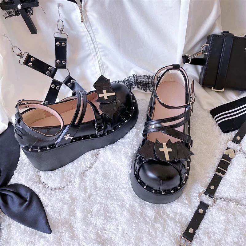 - A stunning gothic devil inspired bat wing platform wedge shoe with strappy buckles!