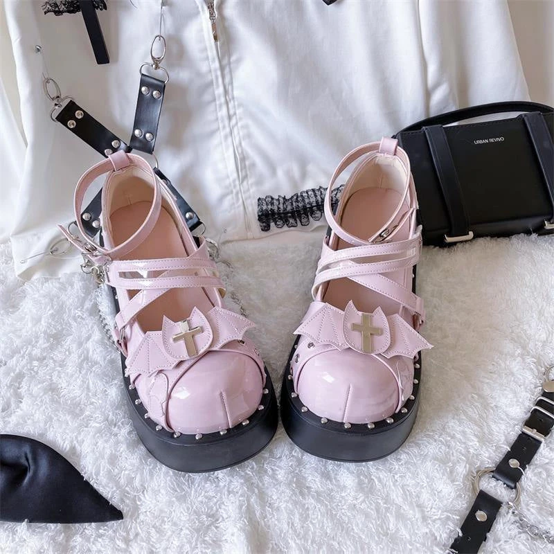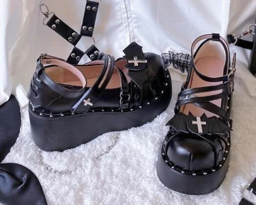 - Featuring devil / bat wings and a metal cross, with a 3 inch platform heel that is super easy and comfortable to walk in!