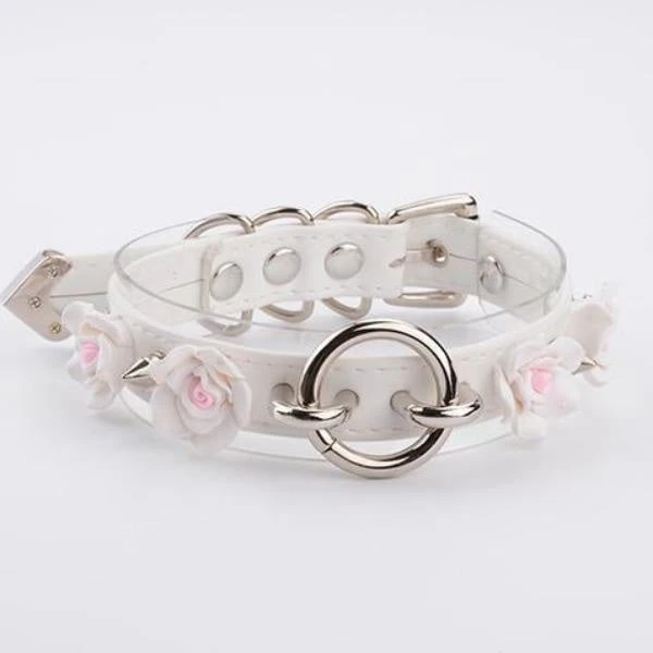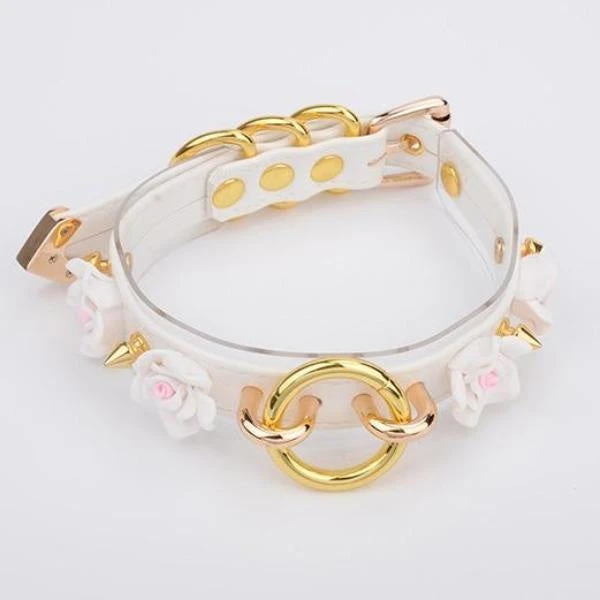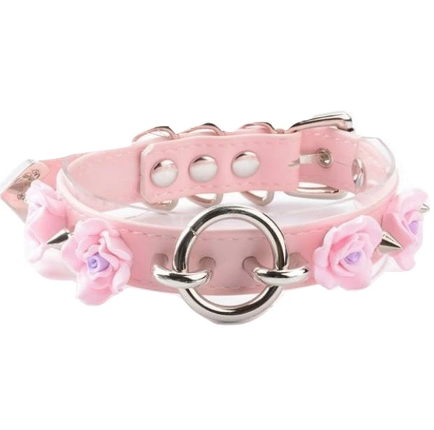 - Â This gorgeous vegan leather O-Ring floral choker necklace has quality silver or gold hardware, belted adjustable buckles, and screams “I’m a edgy princess, but I’m girly and kawaii too”!Â