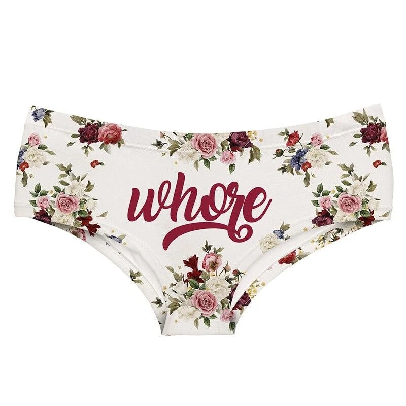 - These undies feature an array of gorgeous flowers all over, with the word “WH*RE” written across the front in beautiful elegant cursive writing.Â
