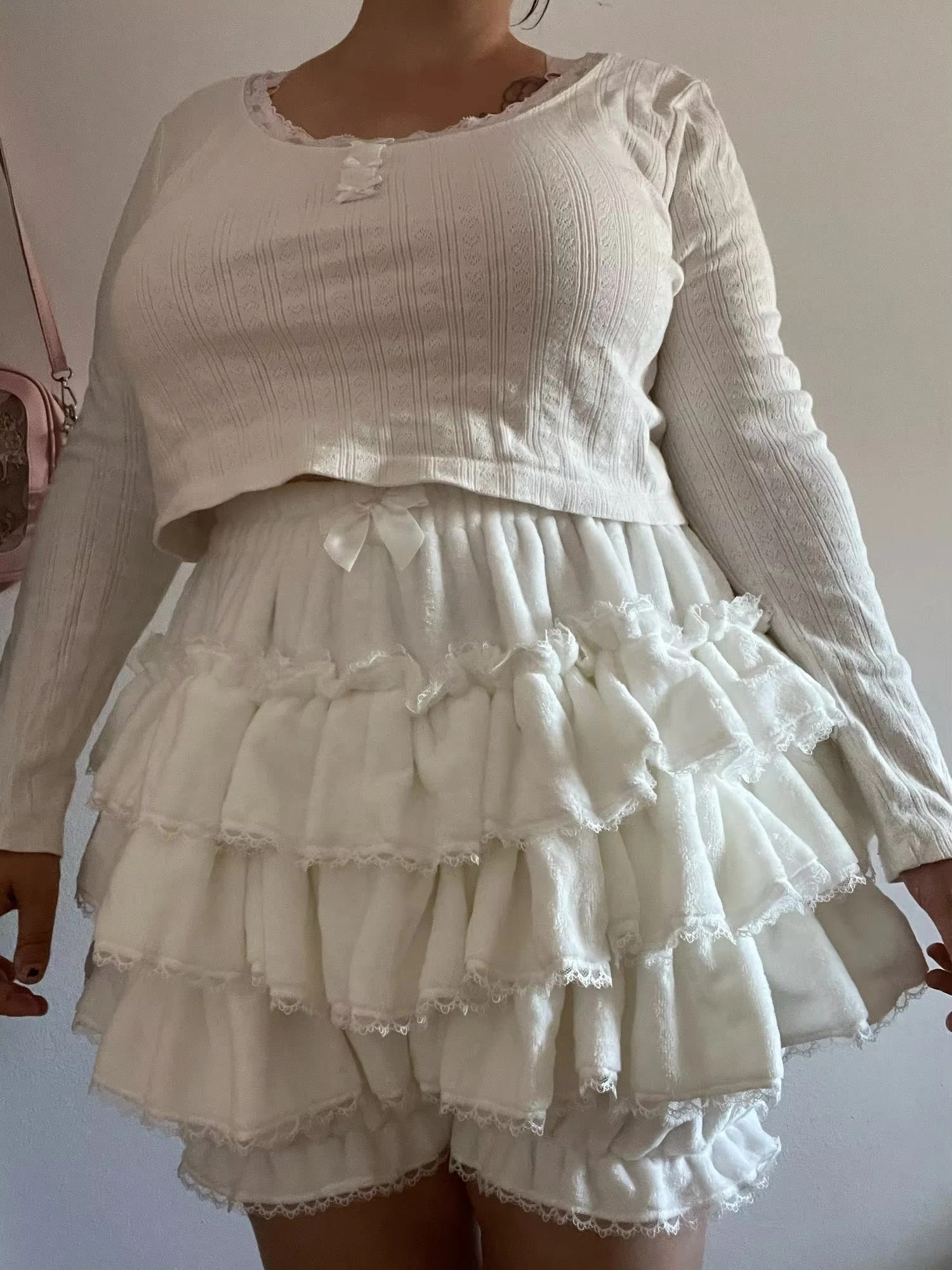 The “Fluffy Ruffled Bloomer Pants” are all about soft comfort and cute style! Perfect for adding a touch of kawaii aesthetic to any outfit, these bloomer pants feature layers of ruffles that create a wonderfully fluffy look.