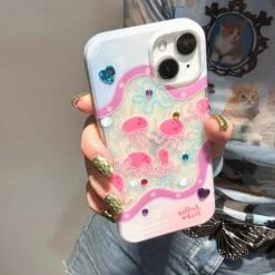 Dive into the deep sea with this kawaii “Glittering Jellyfish iPhone Case”! Featuring adorable pink jellyfish swimming on a sparkly, iridescent backdrop, this case is perfect for adding a splash of underwater magic to your phone. The shimmering jewels and heart embellishments give it that extra touch of cuteness for every jellyfish lover.