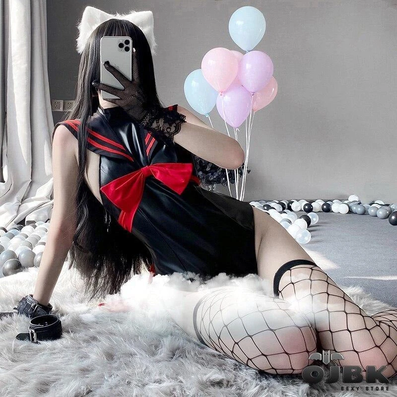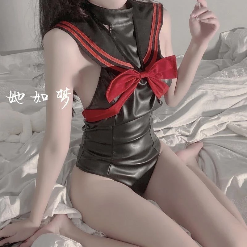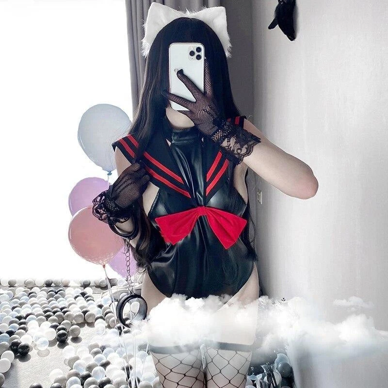 - This black & red sailor collared bodysuit is made of thick high quality vegan leather with a beautiful red ribbon front, traditional sailor collar neckline, and a super flattering cut!Â
