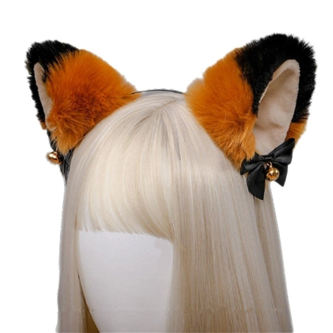 - A stunning and well made fuzzy kitty cat ear headband with cute embellishments such as little golden bells and kawaii black silk ribbons in halloween inspired black & orange.Â
