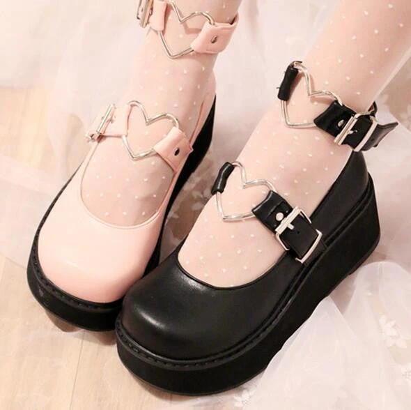 A stunning and traditional style low-heel platform wedge shoe with kawaii heart buckles!