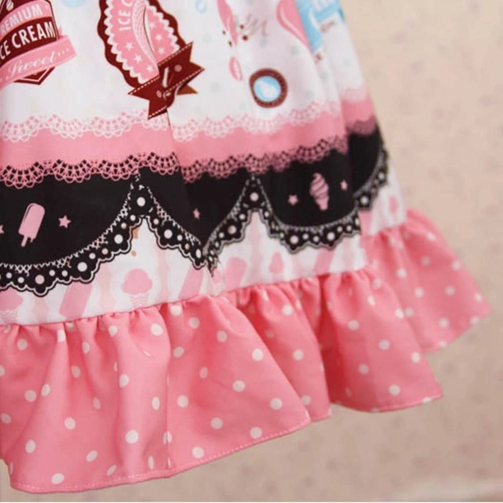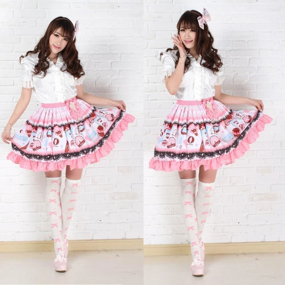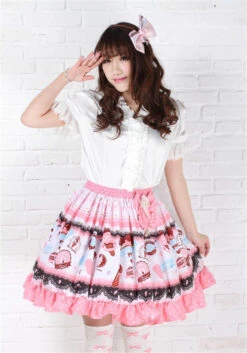 - A beautifully detailed sweet skirt with a gorgeous tea and crumpet style pattern with frilly lace layers and lovely hearts and bows throughout.