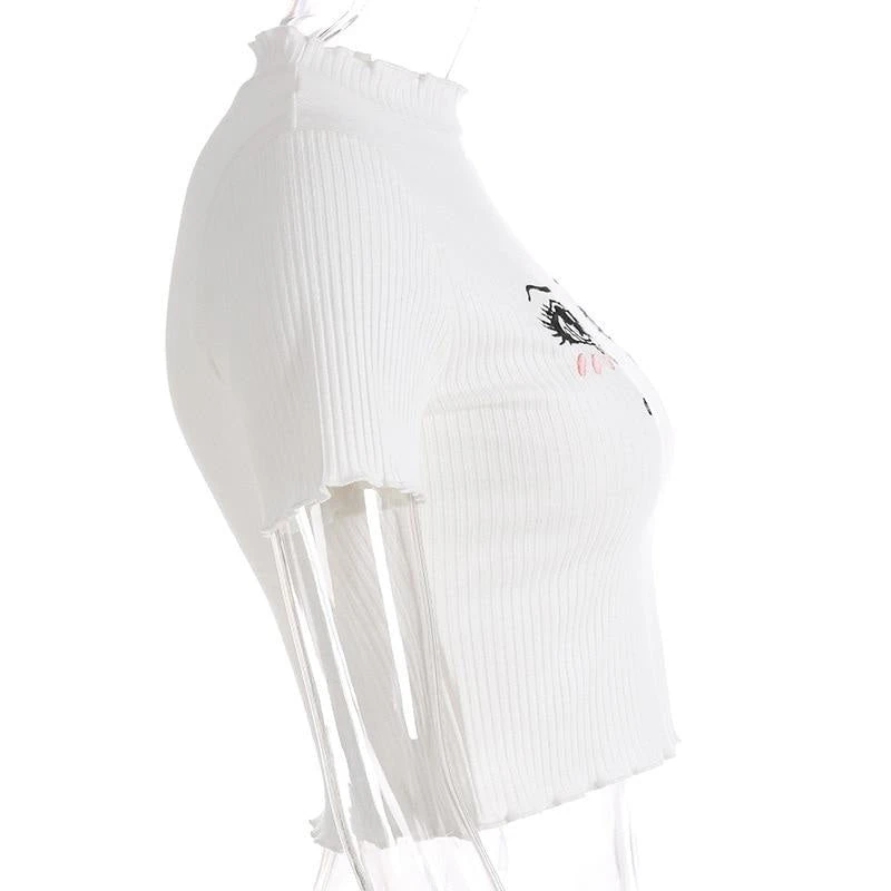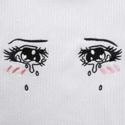 - This delightful bright white soft knit crop top features two beautifully detailed teary-eyed anima eyes hand-embroidered on the chest! So kawaii.Â