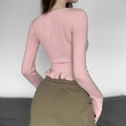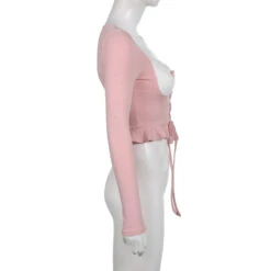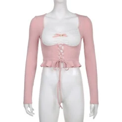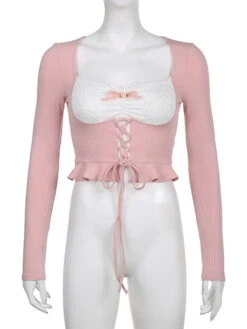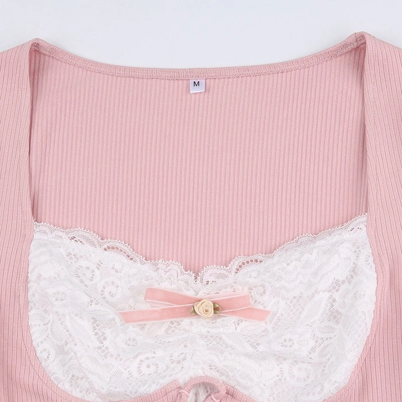 - The white lace embellished upper and pink silk rosebud ribbon on the chest give off a nymphette and princess vibe, while the frilly trim all over adds a touch of femininity and delicacy.