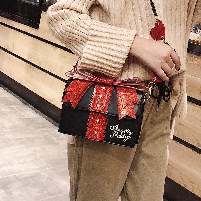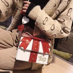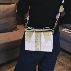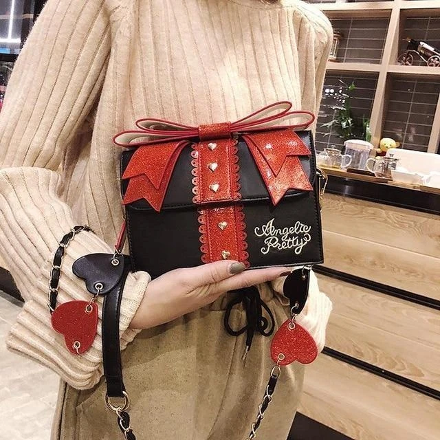 - This gorgeous glittery and shimmering purse is in the shape of a present / gift package, with a pretty little bow on top!