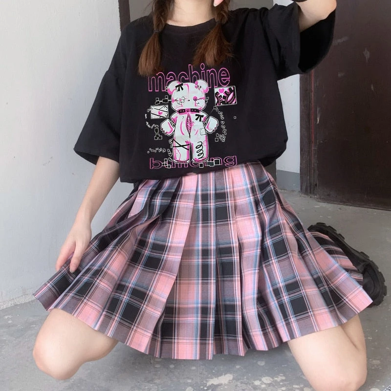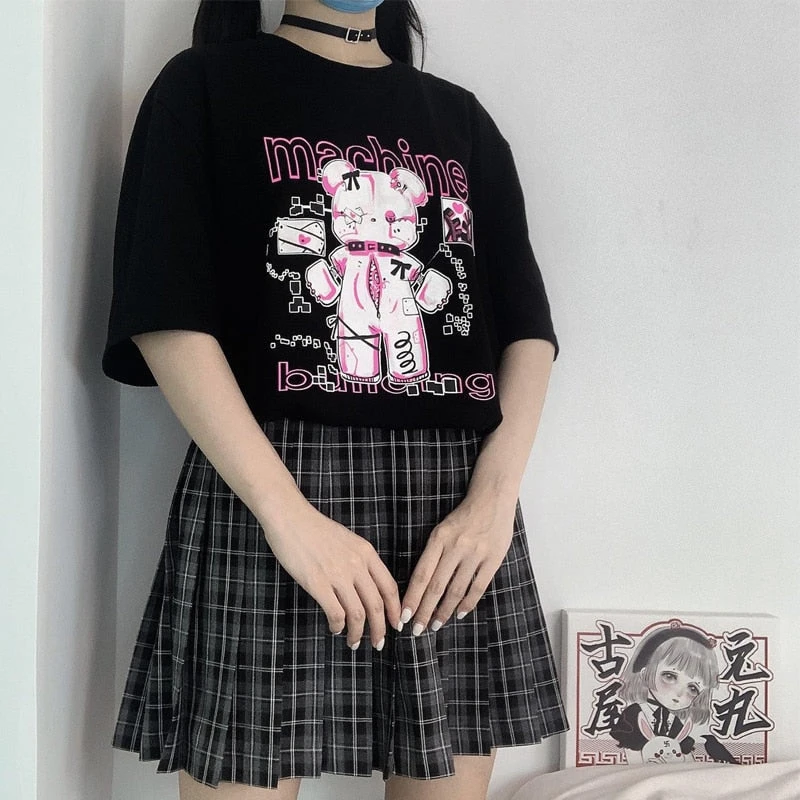 Step into the world of kawaii fashion with the Machine Bear Menhera Tee! This oversized black t-shirt is the ultimate in creepy cute style, perfect for fans of pastel goth or goth aesthetics. With its bold and edgy design, this tee showcases a unique blend of cyber-anime influences, making it a must-have for your wardrobe.
