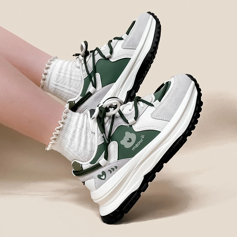 Kawaii Cat Design: Featuring an adorable cat logo with a “meow” detail, these sneakers add a touch of cuteness to your casual look. The army green accents bring a trendy, modern vibe that complements any outfit.