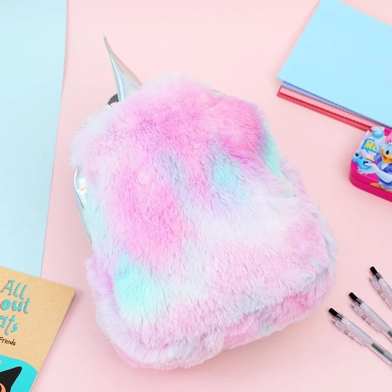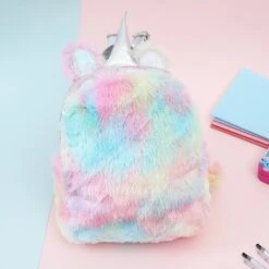 - Embrace your fairy kei side and sport this fluffy book bag with holographic straps and unicorn horn!