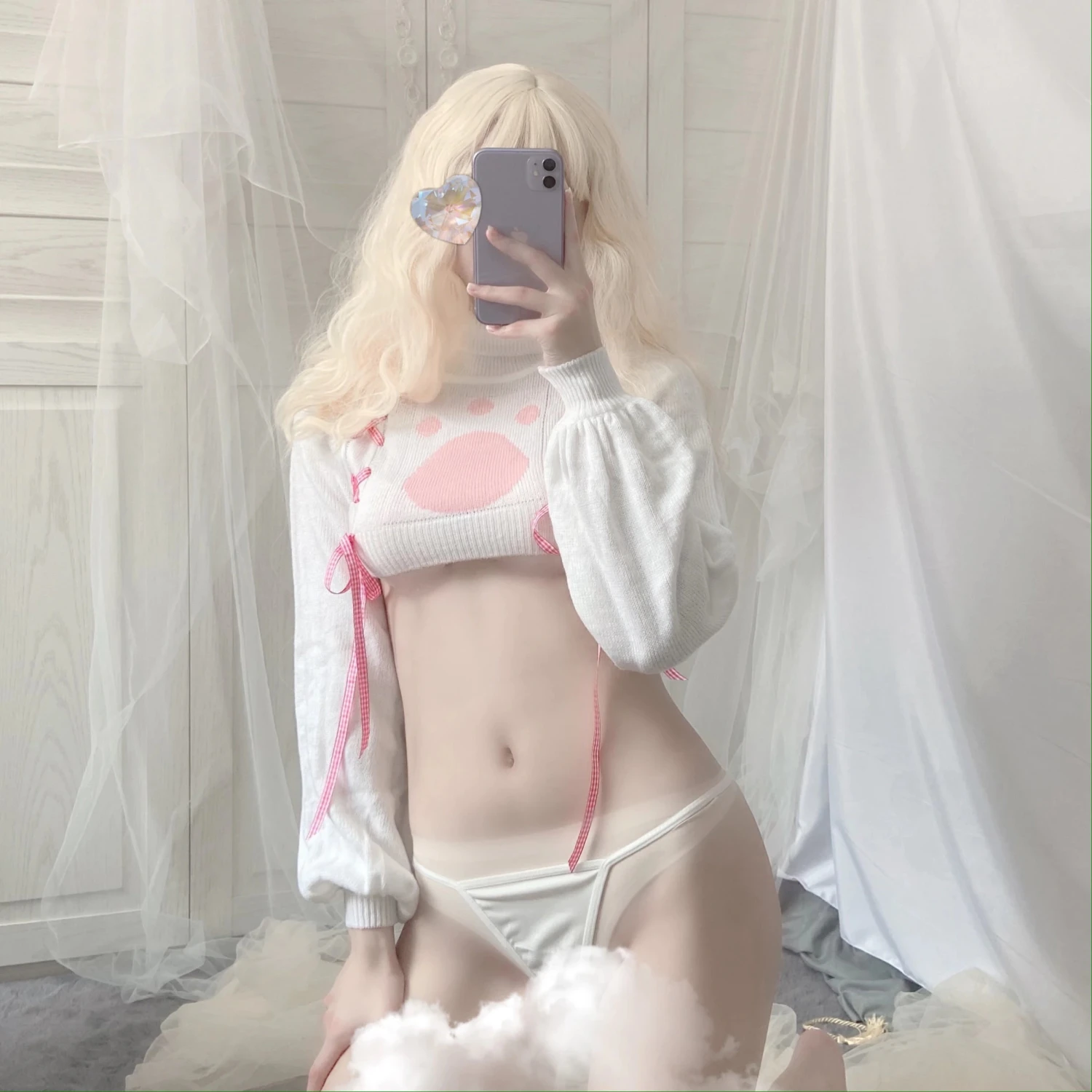 - With a bright white mini crop top with a pink cat paw and pastel pink ribbons.