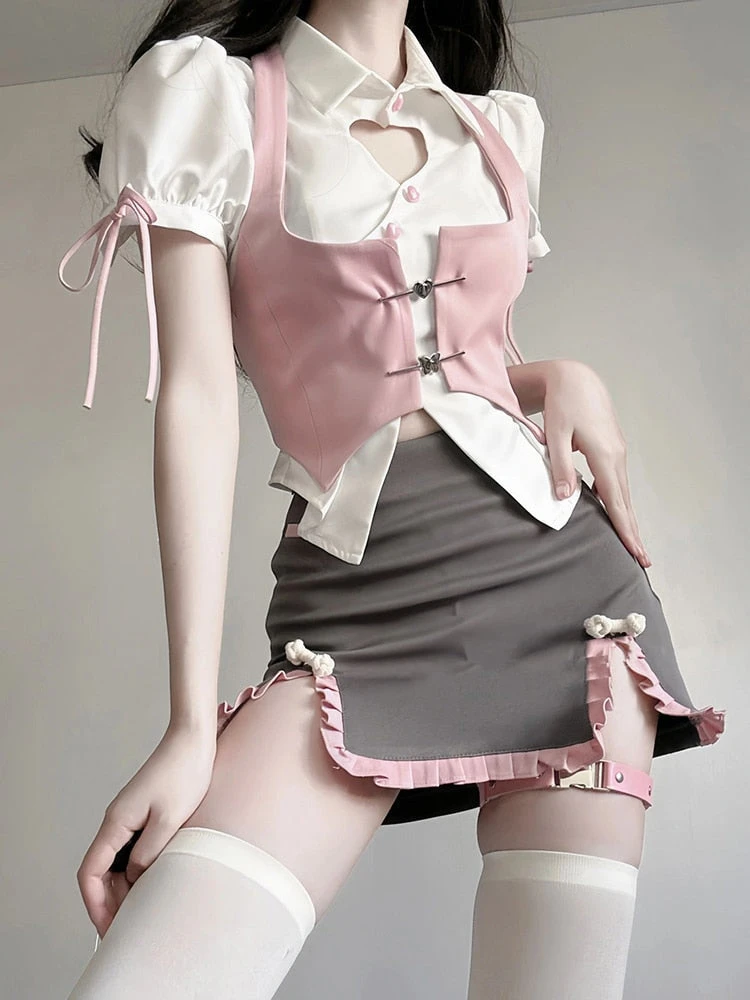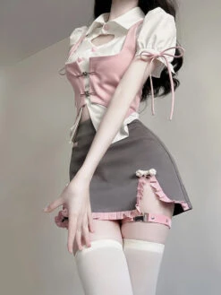 - Two-Piece Set: The outfit includes a fitted grey skirt with adorable pastel pink ruffle accents, paired with a matching pink vest layered over a white puff-sleeve top.
