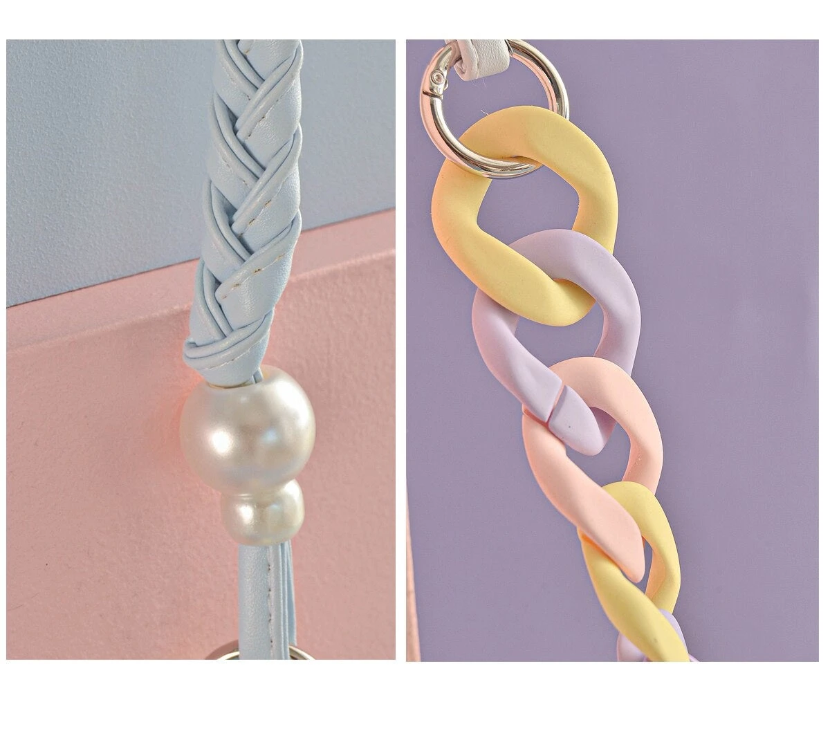- The option to choose between a chunky rainbow oversized chain strap or a dainty pearl strap to match your aesthetic style