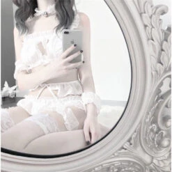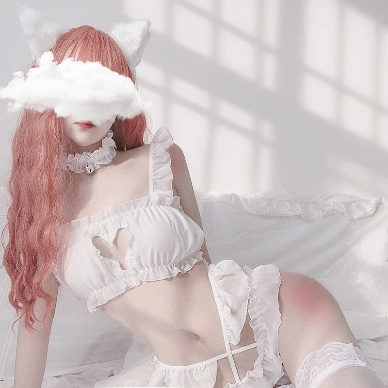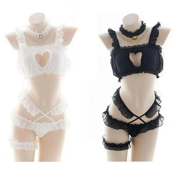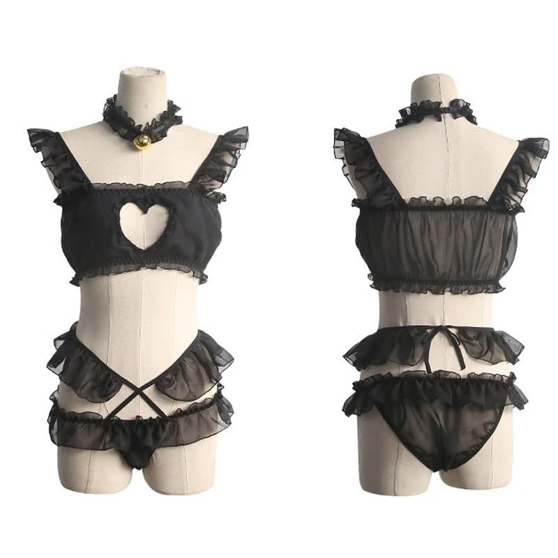 This luxurious ruffled bra and panty set has gorgeous hand-details including beautiful criss-cross harness style panties, a peekaboo heart cutout on the chest, beautiful matching cat bell collars and garters, and so much more! Â
