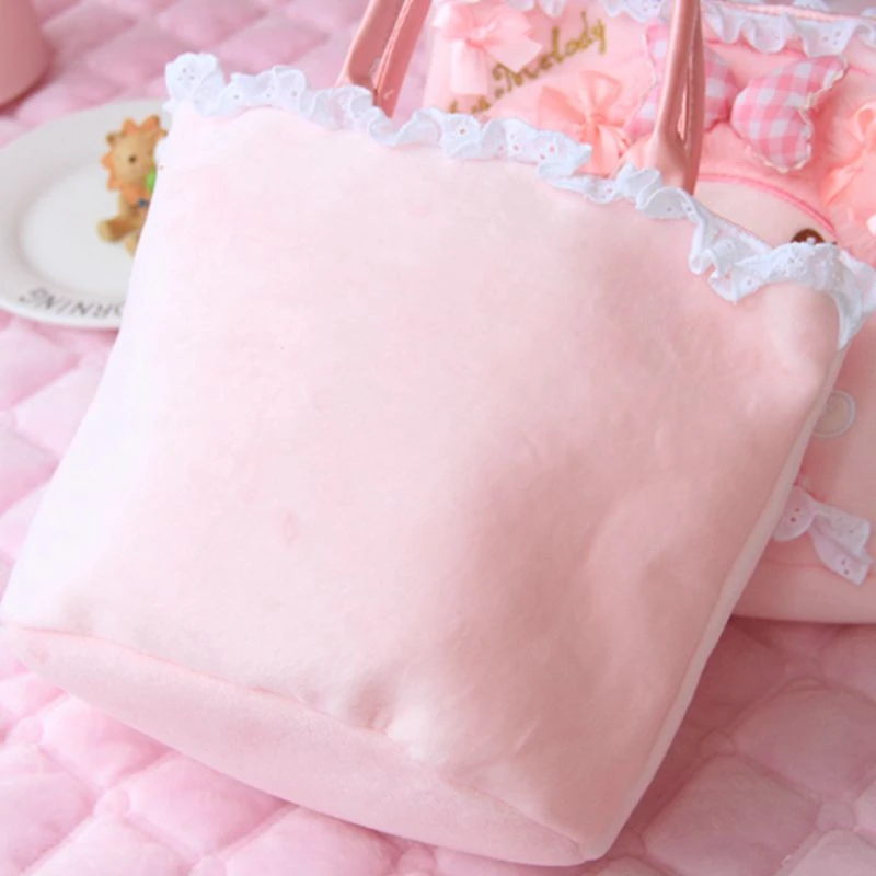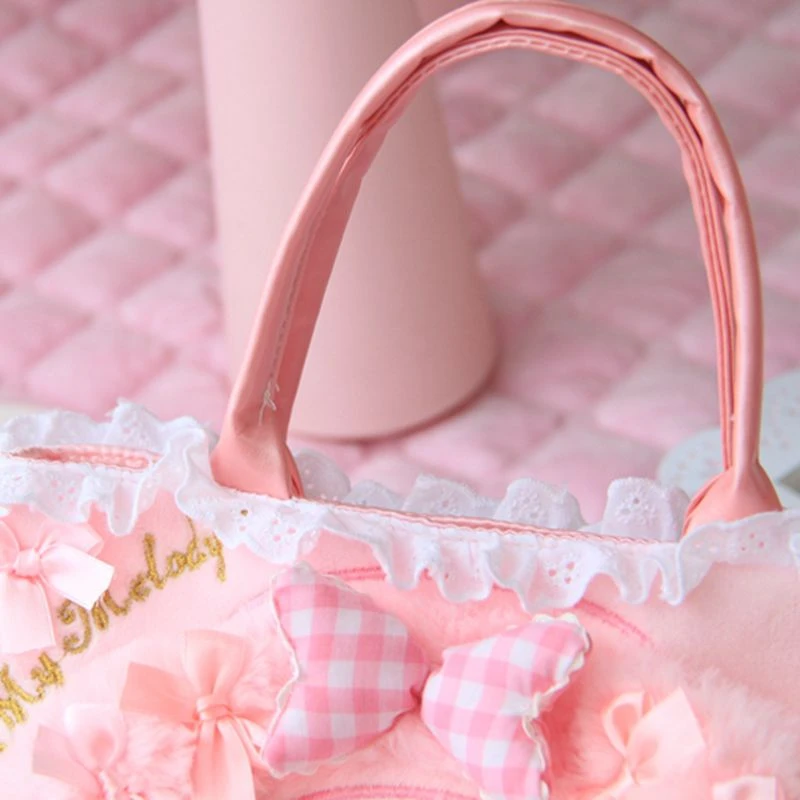 - A gorgeous sweet pink bunny plush bag with pink girly detailing such as ribbons, bows, and lots of frills.