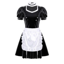 - Made of gorgeous shiny vegan wet-look fabric that’s comfortable to wear, with a saucy removable apron and girly white ruffled trim.