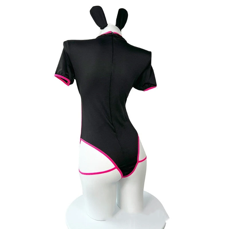 - Made of comfortable stretchy fabric with a black & pink aesthetic, cute matching bunny ears, criss-cross laces across the torso, and a heart peephole on the chest!