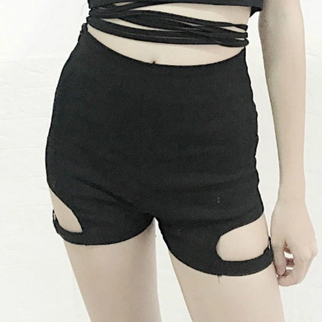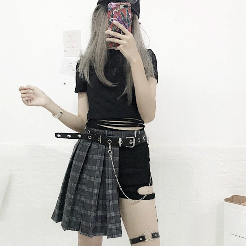 - Recreate this entire look with the stomach-wrap t-shirt, black shorts, grey plaid skirt, and matching black leather belt! Or mix and match and create your own gothic look!Â