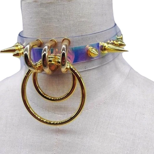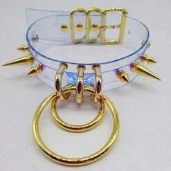 - This gothic clear collar features punk rock metal spikes in gold or silver, with 2 large O-ring hooks to attach whatever you want!