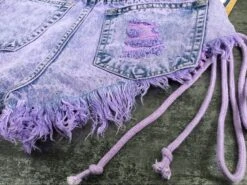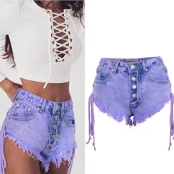 - These gorgeous lavender purple stone-washed distressed high waisted denim shorts will score you endless compliments. With lace-up corseted sides, full button closures, and frays along the edges, these are pure pastel perfection and a total must-have this summer! Â