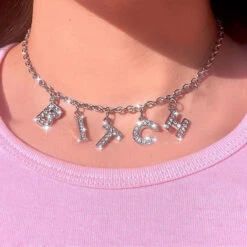 - The pendant itself consists of a solid silver plated chain, and high quality glam letters with rhinestone embellishments.