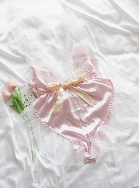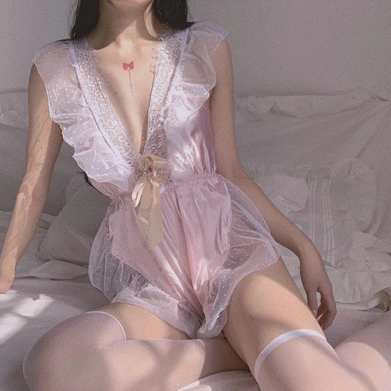 - This luxurious silky satin & lace lingerie bodysuit has gorgeous hand-details including ruffled lacy trim, a silk bow, and gorgeous embroidery.Â