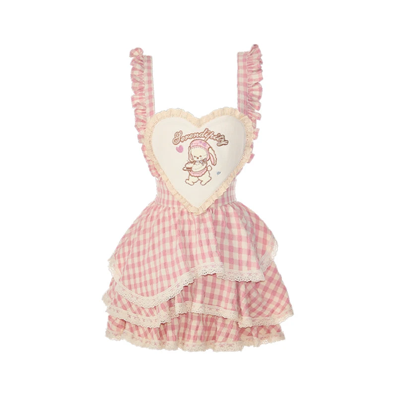 - 🐇 Heart-Shaped Suspender Dress: Fall in love with the charming heart-shaped suspender dress featuring an embroidered bunny on the front and the word “serendipity.” It’s pure whimsy and luck all in one!