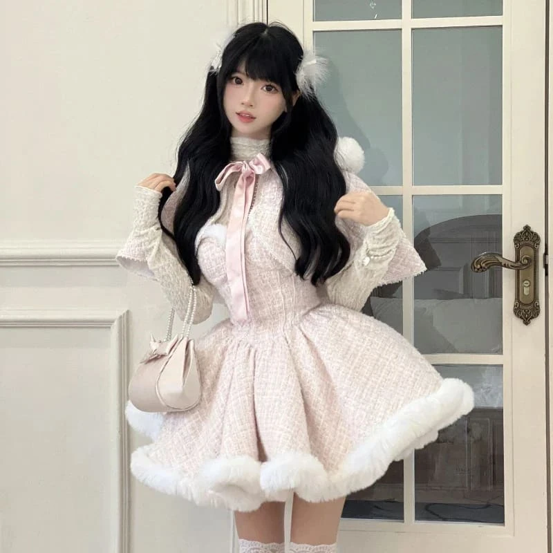 Wrap yourself in cozy pastel elegance with the Snow Dumpling Tweed Outfit Set, the perfect blend of kawaii fashion and winter warmth. This adorable coat dress set features a soft pastel tweed fabric, fluffy faux fur trim, and a delicate capelet hood for the ultimate fairy kei winter look. Whether you’re strolling through snowy streets or dressing up for a cute winter cosplay, this outfit keeps you feeling warm and looking cute.