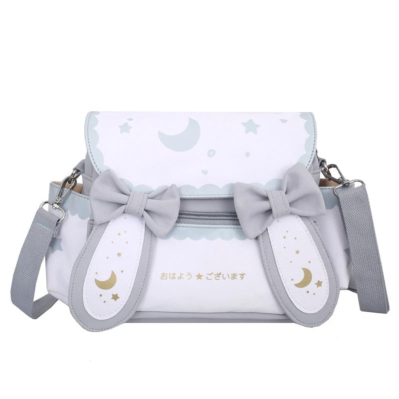 - With cute little ribbons & stars & moons on the end of the long bunny ears, this white little rabbit purse is simply the cutest!Â