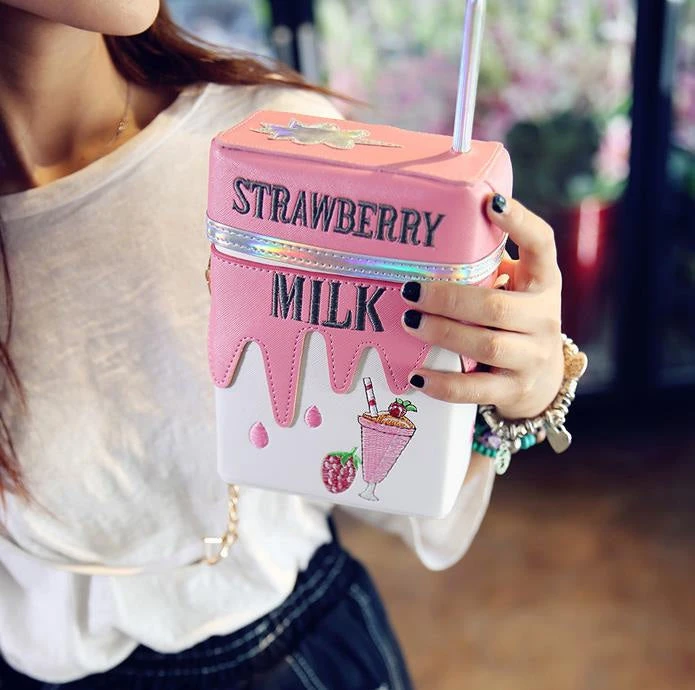 - The eye-catching design includes detailed embroidery of a strawberry and a milkshake glass, enhancing its kawaii appeal. The pink hue is complemented by a drippy cream design and bold, readable text that adds a fun twist to the classic purse silhouette.