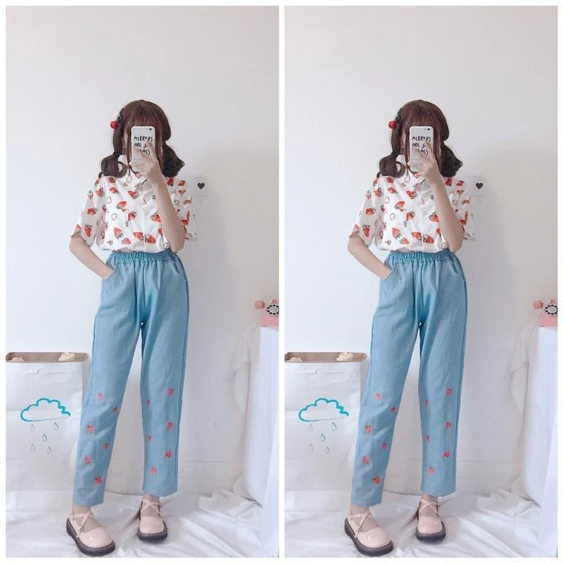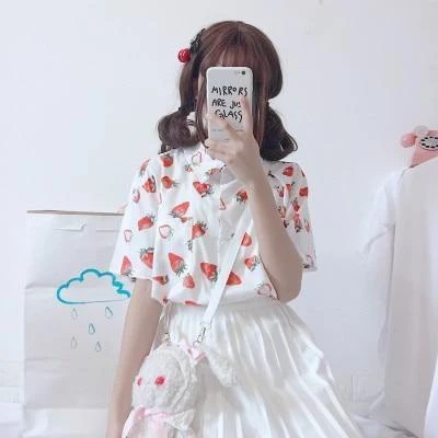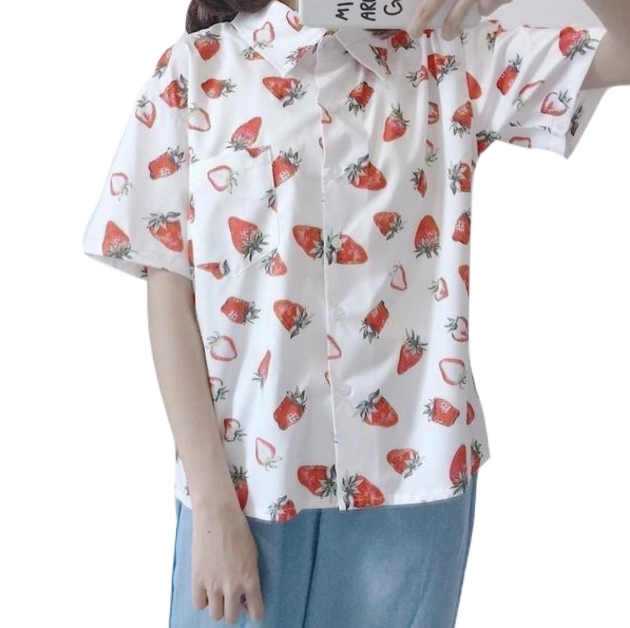 - This gorgeous white strawberry print button up top is a must have for any kawaii babe with a love for all things strawberry, kawaii, and precious!