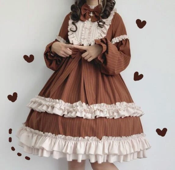 Add a touch of kawaii academia to your wardrobe with this adorable “Sweet Brown Academia Dress”! This charming piece features a warm brown pinstriped fabric with layers of soft, ruffled accents that give it a unique and cozy vibe. Perfect for fans of the kawaii aesthetic, this dress combines a scholarly look with soft, feminine touches.