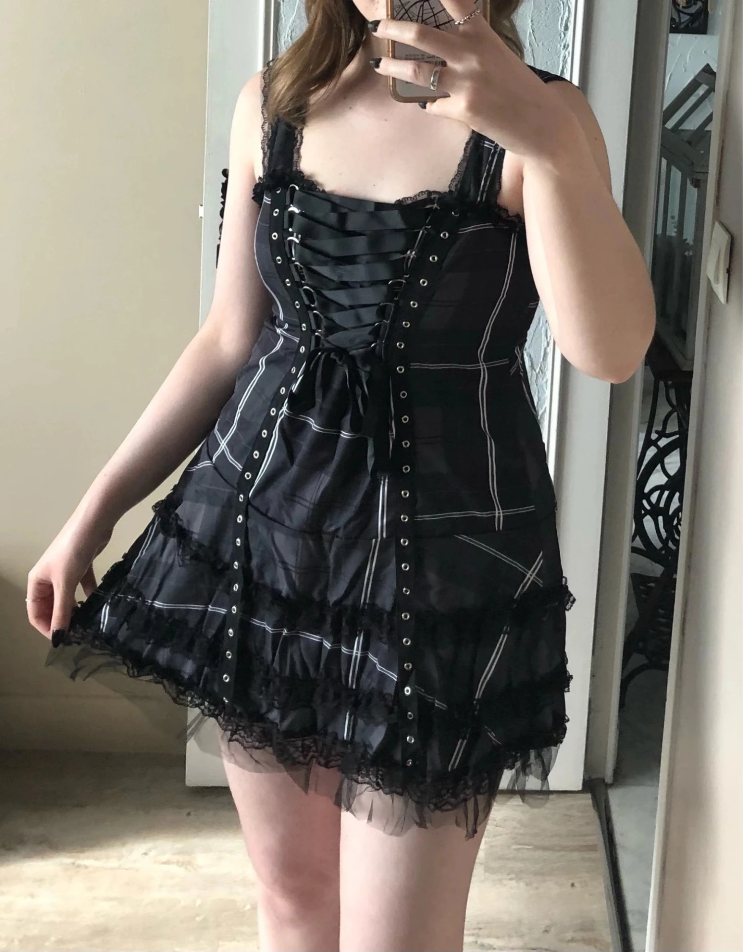- This spooky and pagan occult inspired tartan plaid lace-up dress is sure to impress! Perfect for gothic babes who embrace dark fashion aesthetics with a pin-up girl twist!Â