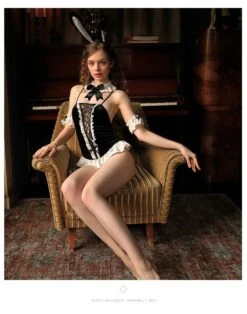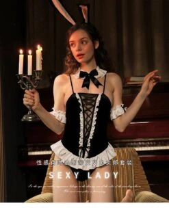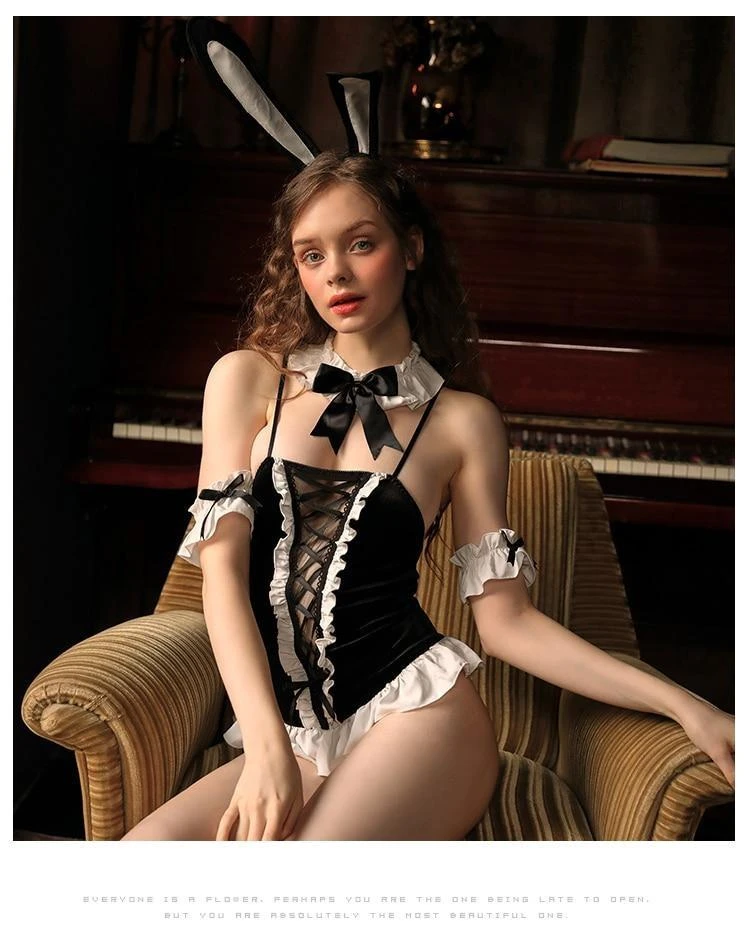 Includes the stunning frilly lace-up bodysuit bodysuit, collar, arm wristbands, and black bunny ears: this is the perfect bunny outfit for those extra special occasions!Â
