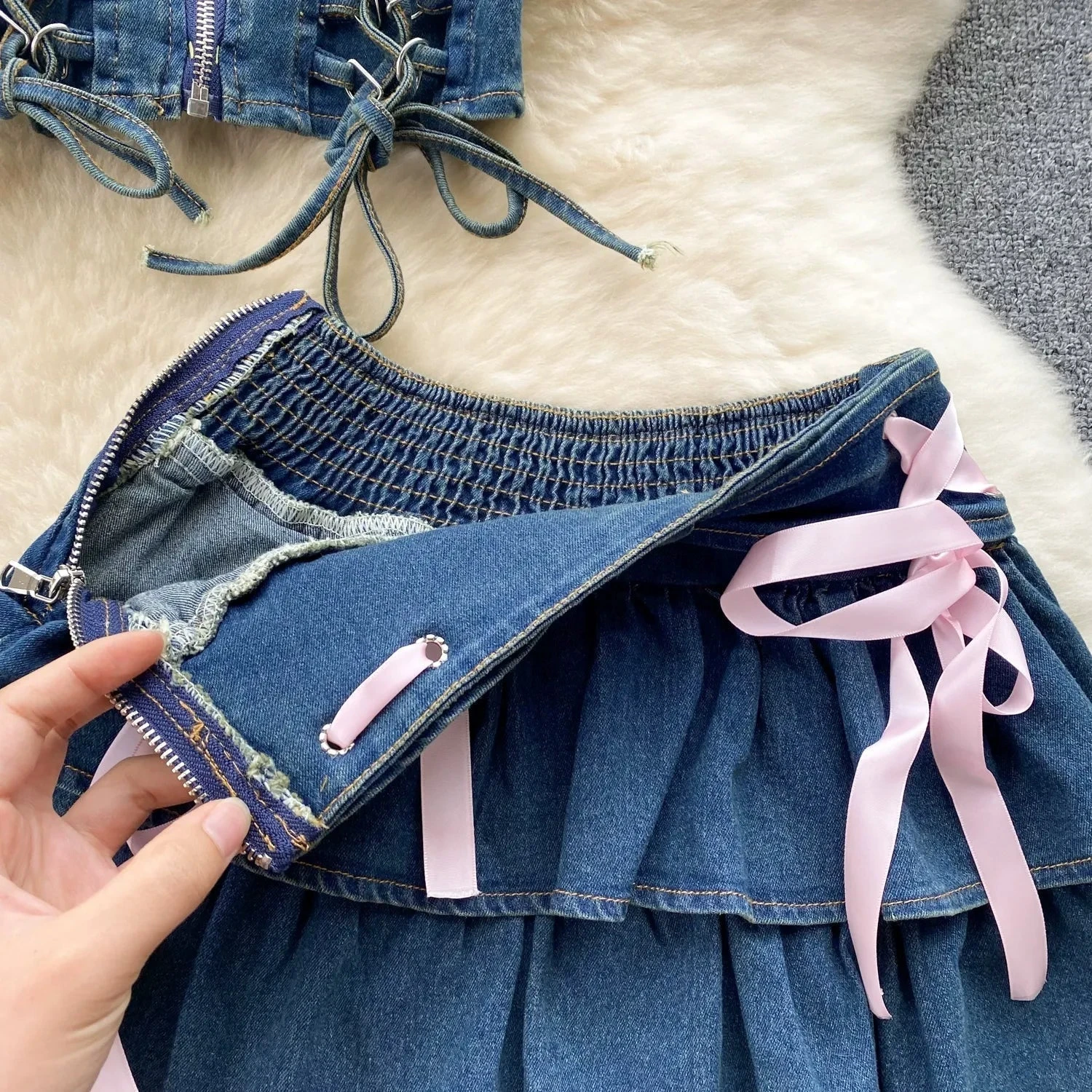 Turn up the kawaii aesthetic with this adorable “Tiny Denim Dancer Outfit Set”! This set features a corset-style denim top and layered shorts that are perfect for adding a touch of fun and flair to your wardrobe.