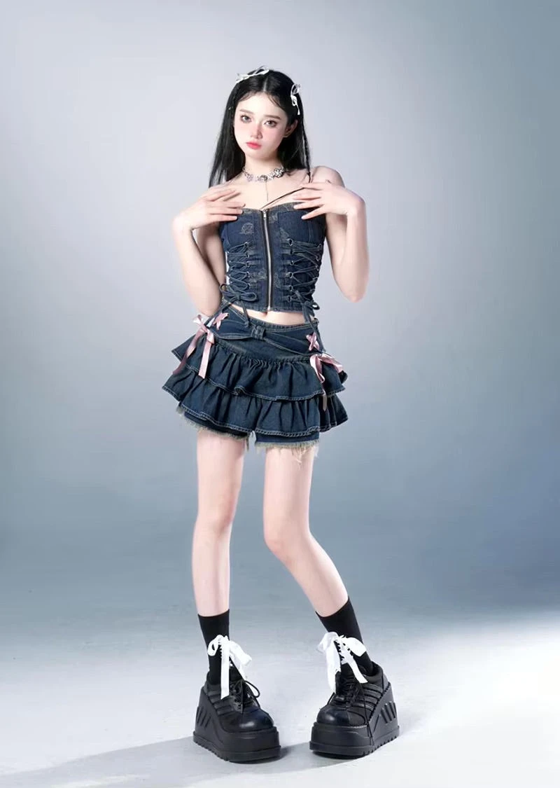 - Corset-Style Top: The denim corset top has lace-up detailing on both sides with a front zipper closure, blending a structured fit with a touch of edgy style.