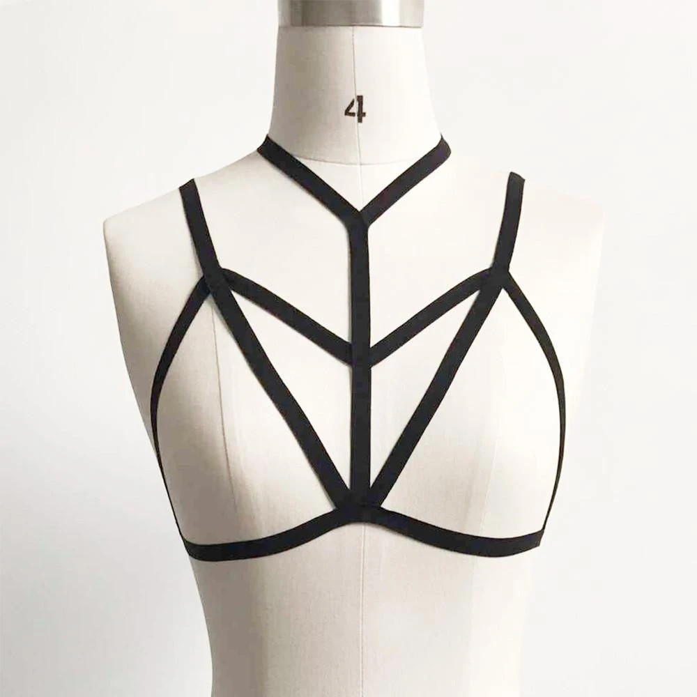 - This elegant and chic Y pattern chest harness has several well placed stretchy straps that adorn your decolage in a very tasteful and elegant fashion.