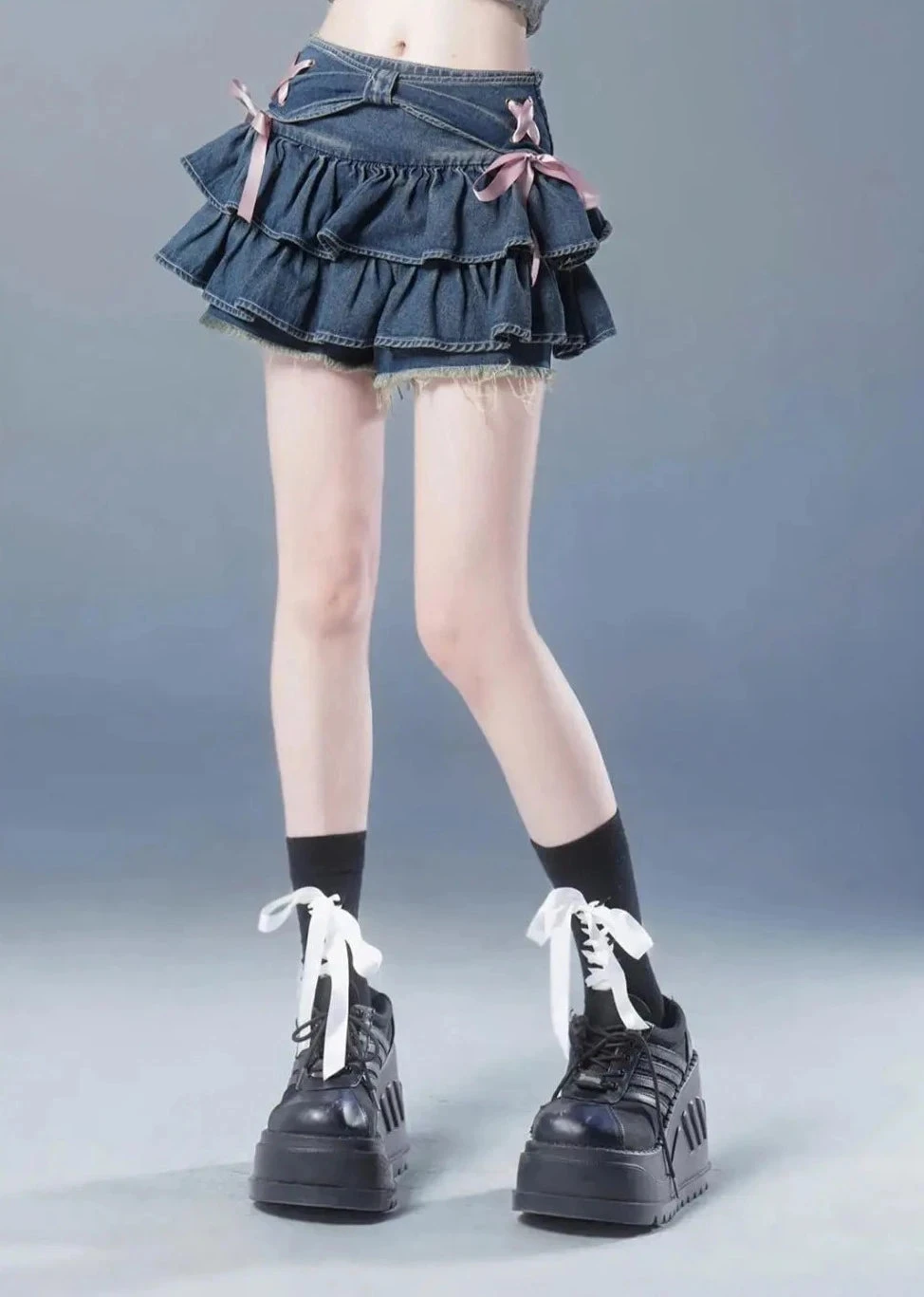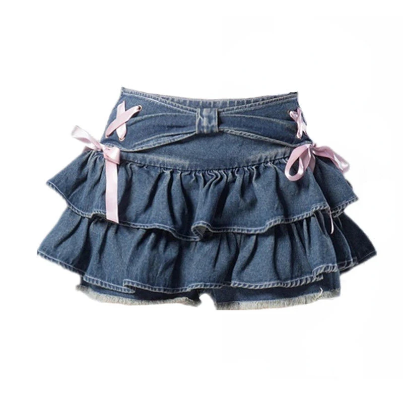 Perfect for anyone loving the kawaii aesthetic, this skirt is a blend of nostalgia and modern flair. The dark denim fabric gives it a versatile and edgy look, while the layered ruffles add an adorable touch of texture. Pink satin bows on each side create a sweet contrast against the denim, giving off a cute and feminine vibe.